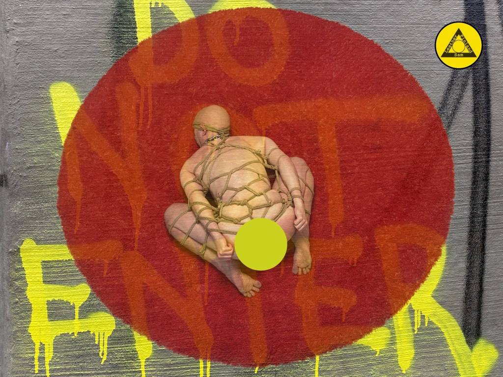 The square-shaped structure bears witness to this unsettling convergence of the physical and the metaphysical, a collision of pleasure and release, as the young man’s body seemingly betrays its usual boundaries, leaking its long stored cum and body fluids into the structures that surrounds him.